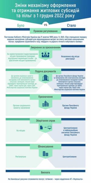 Починаючи з 1 грудня 2022 року Пенсійний фонд України буде не лише виплачувати, а й призначати житлові субсидії та пільги: тобто громадяни, які витрачають на оплату комунальних послуг більше, ніж 15% сукупного місячного доходу домогосподарства, з 1 грудня для призначення субсидії мають звертатися до органів Пенсійного фонду України. При цьому людина може самостійно обрати до якого саме сервісного центру Фонду їй зручно звернутися. Це не залежить від місця її офіційної реєстрації.